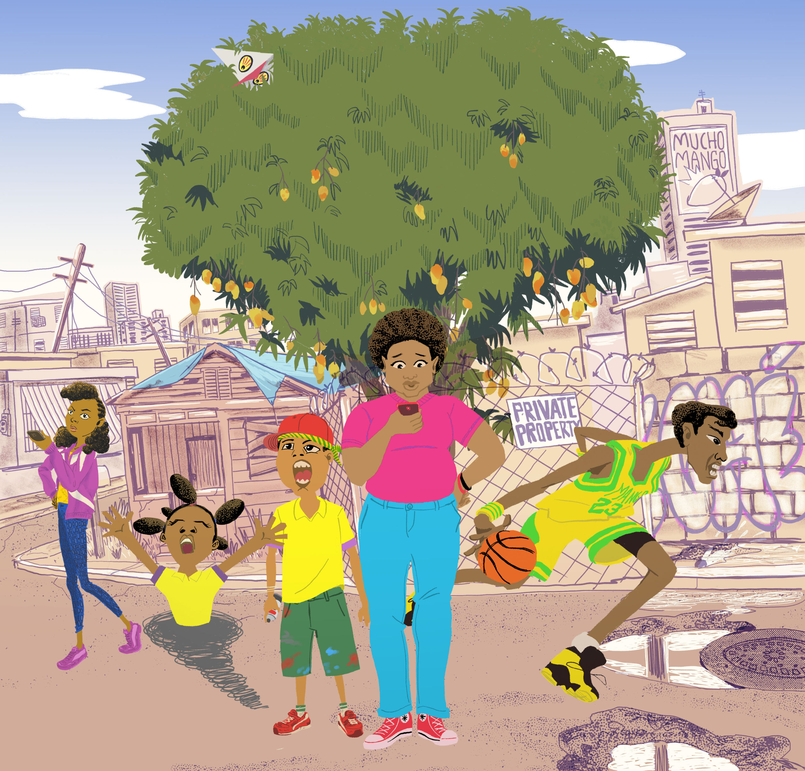 Adaptación a novela gráfica de la obra de títeres de mesa de 2010 de Papel Machete El Barrio del Mangó Bajito. En la historia, cuatro primos luchan contra la gentrificación cuando la casa de su difunta abuela es destruida para construir una franquicia de bebidas con sabor artificial a mangó, Mucho Mango®. Para vencer, deben descubrir la historia del barrio y, de paso, heredar una lección que les dejó su abuela: el barrio –y su gente– no están a la venta.