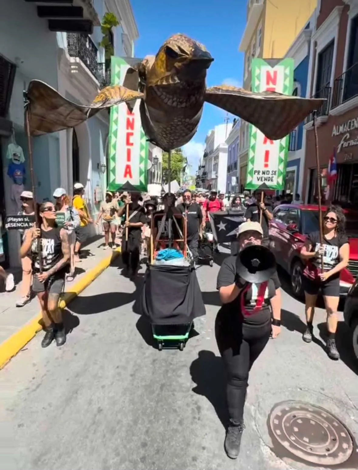 For the march, we contributed by designing the ¡ESENCIA NO VA! poster—plastered throughout the island—and by building our first giant puppet in years: the Guabairo, an endemic, endangered nocturnal bird that inhabits southwestern Puerto Rico, including Cabo Rojo, Peñuelas, Yauco, Guayanilla, and the dry forest of Guánica.